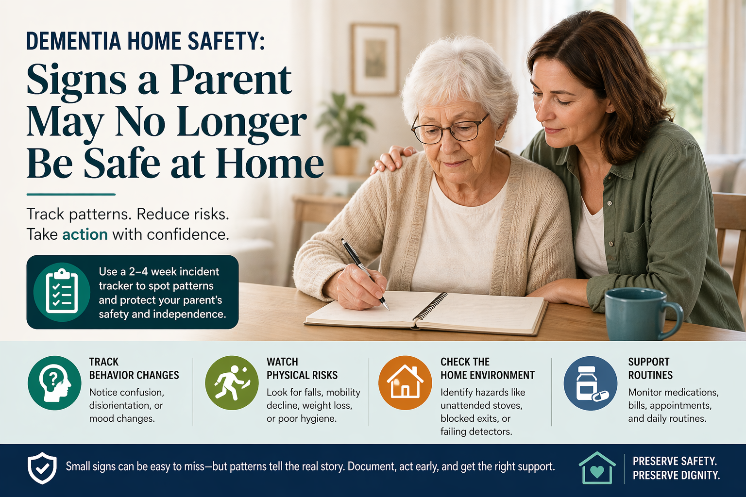Start here, not with worry: spend the next 2–4 weeks logging what you see. Small incidents are easy to dismiss in the moment. Tracked together, they reveal patterns that distinguish normal forgetfulness from true safety risks.